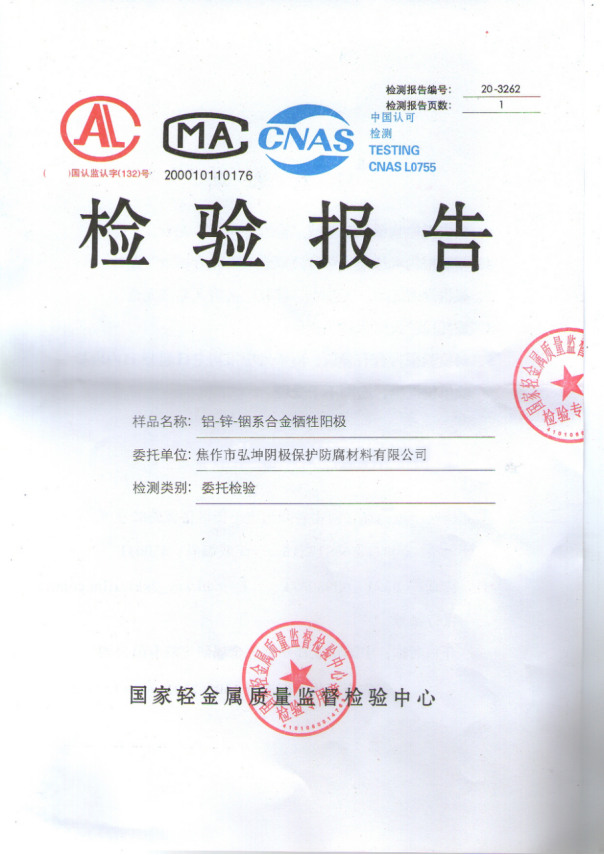 鋁-鋅-銦系合金犧牲陽極檢驗(yàn)報(bào)告Ⅰ